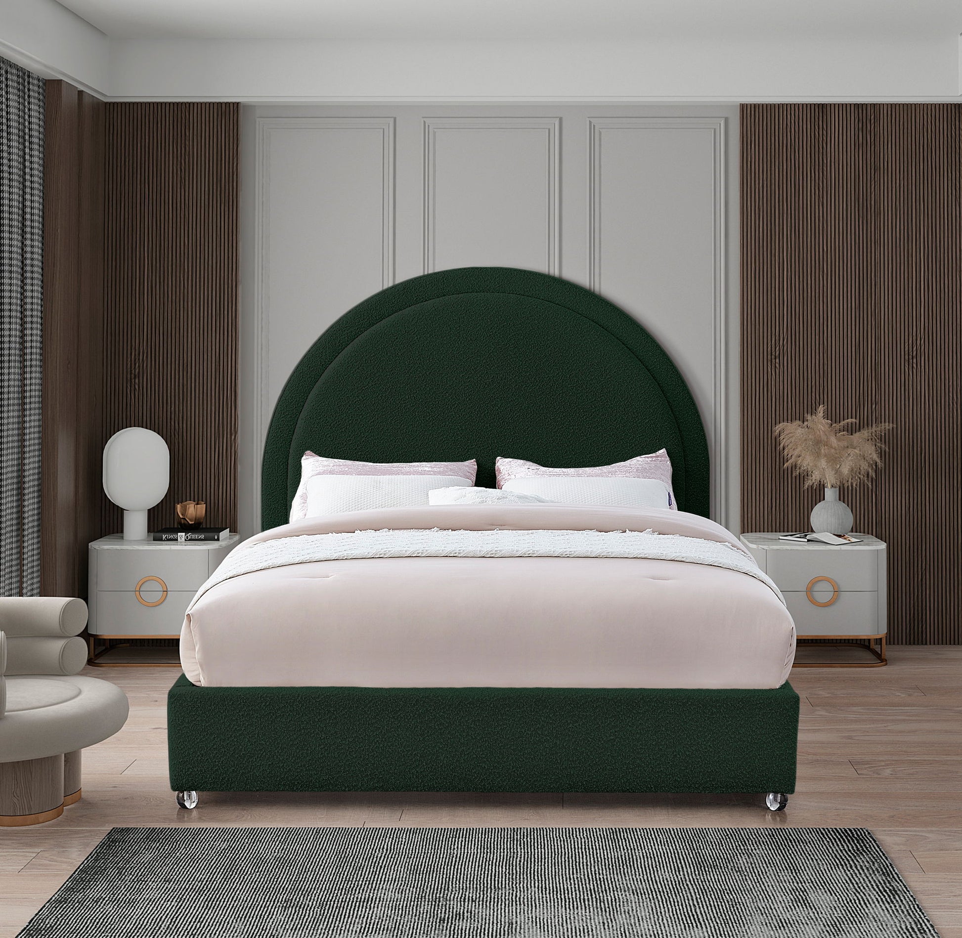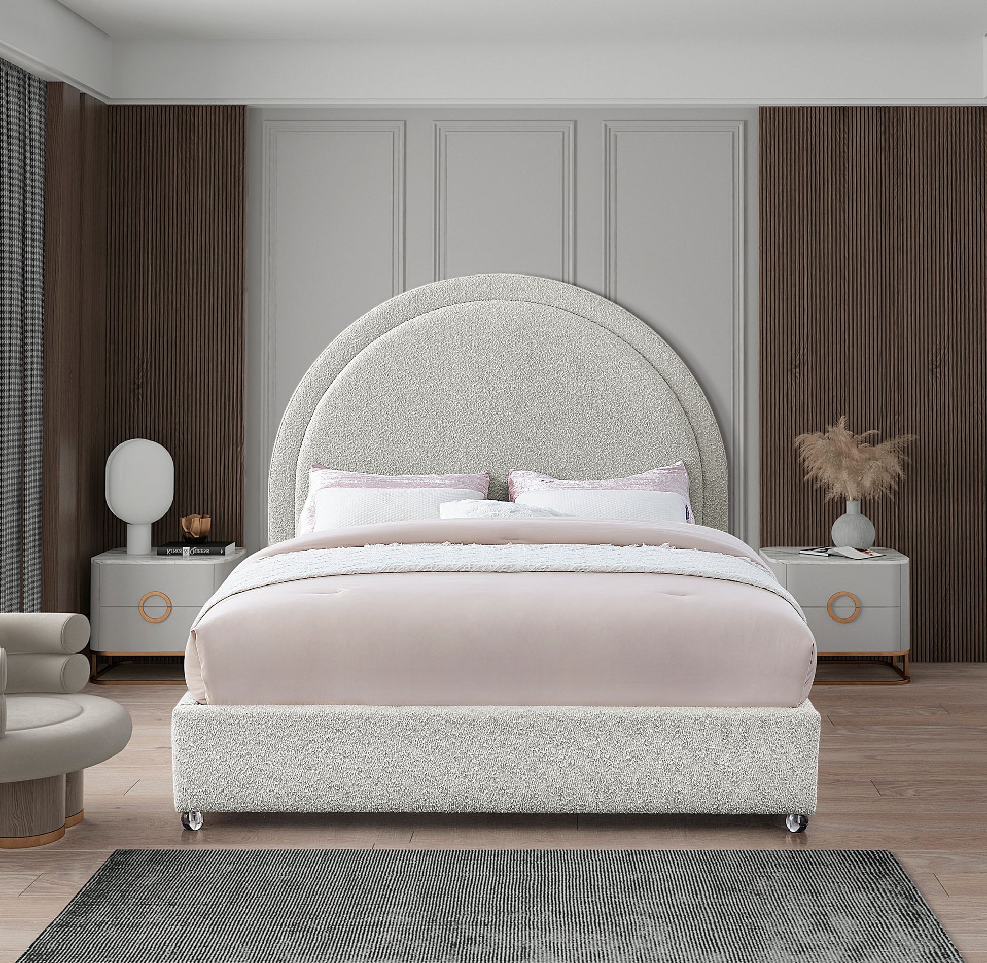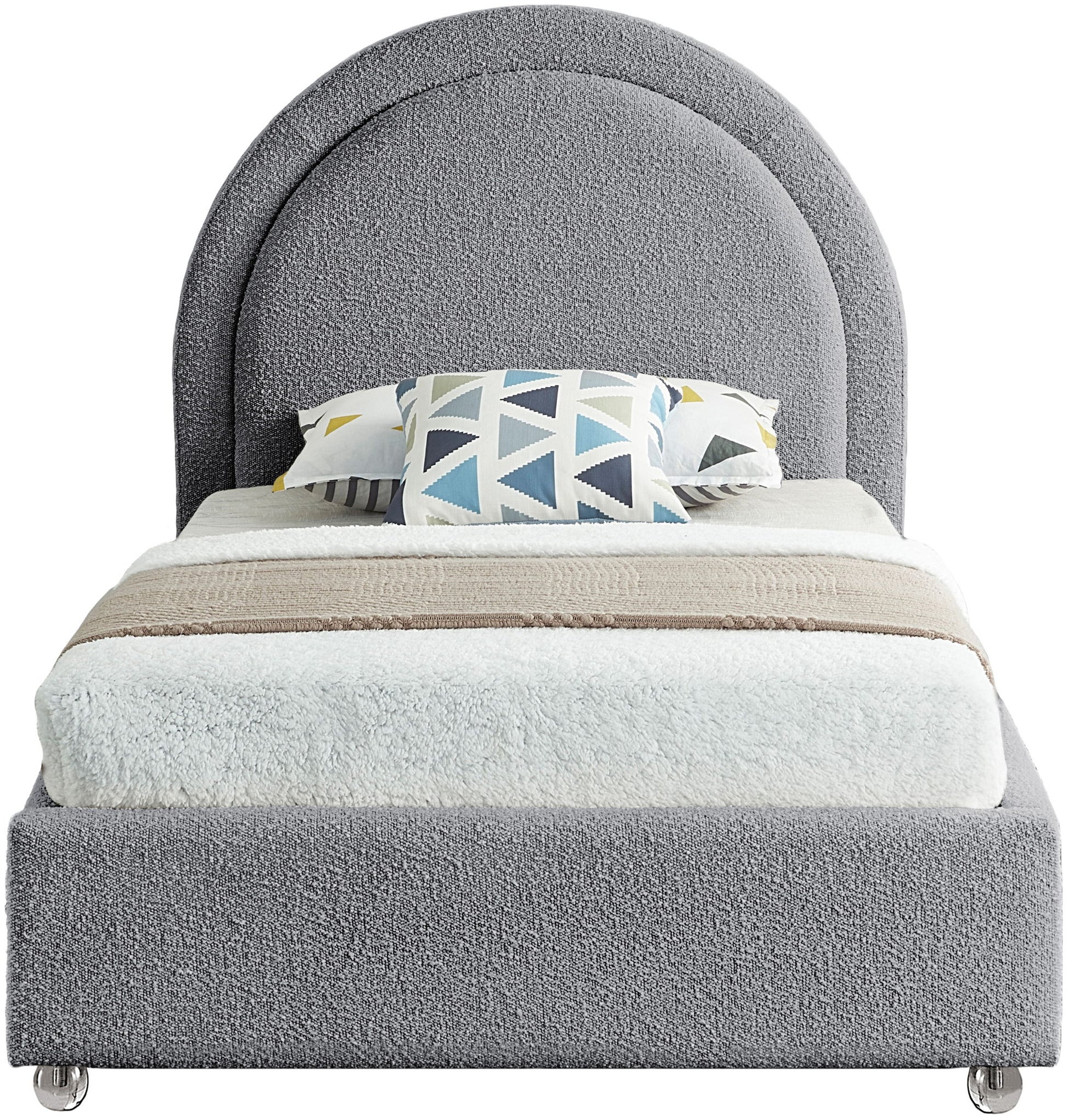 Get ready for compliments when you add this Milo boucle fabric bed to your space. It's upholstered head to foot in rich boucle fabric, so it's soft to the touch and regal to the eye. The star of the show is the bed's rounded headboard, which stretches out tall above you for a look that oozes regality and sophisticated charm. Acrylic legs give the bed a somewhat modern finish.