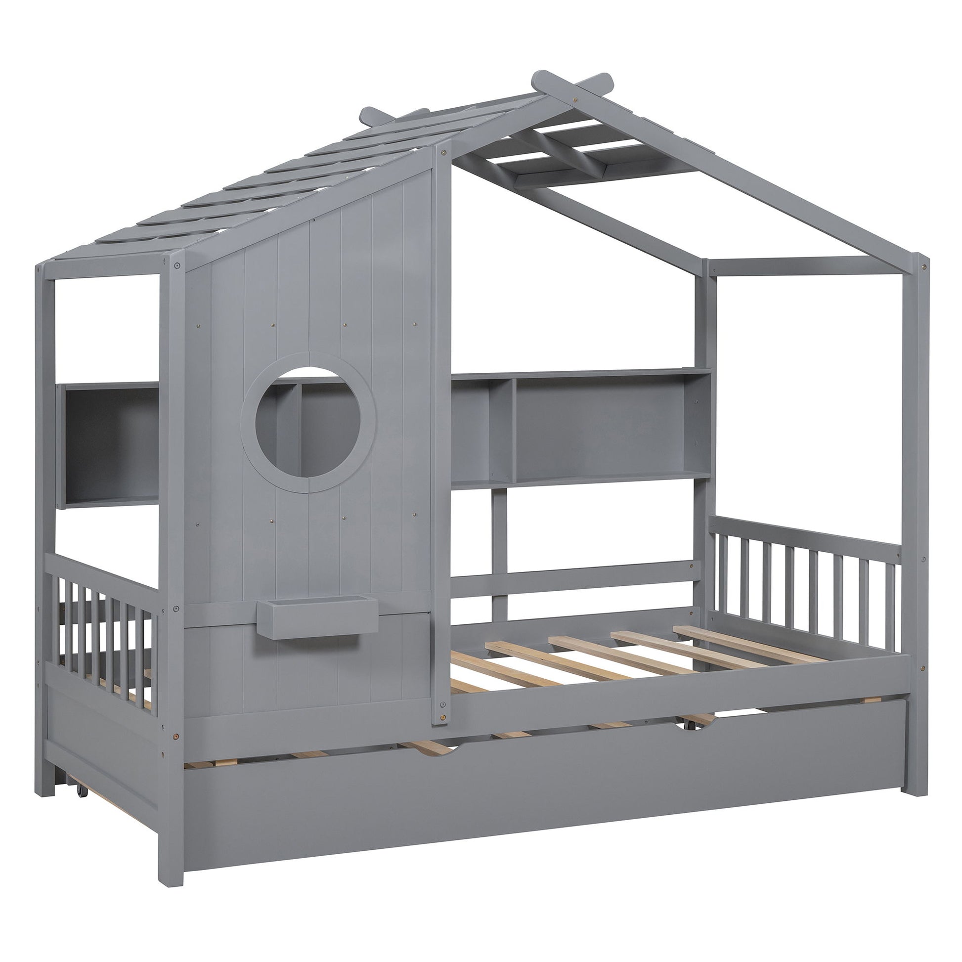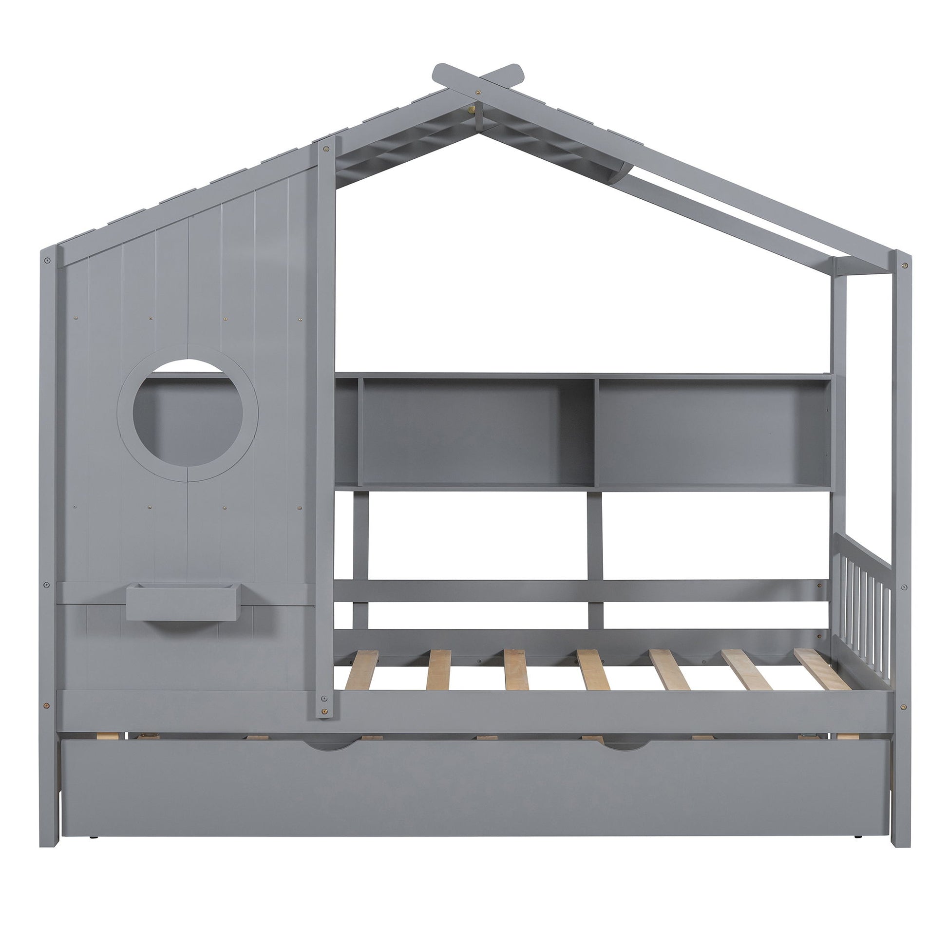 Twin Size House Bed With Trundle, Modern Design For Kids With Storage Shlef - Gray