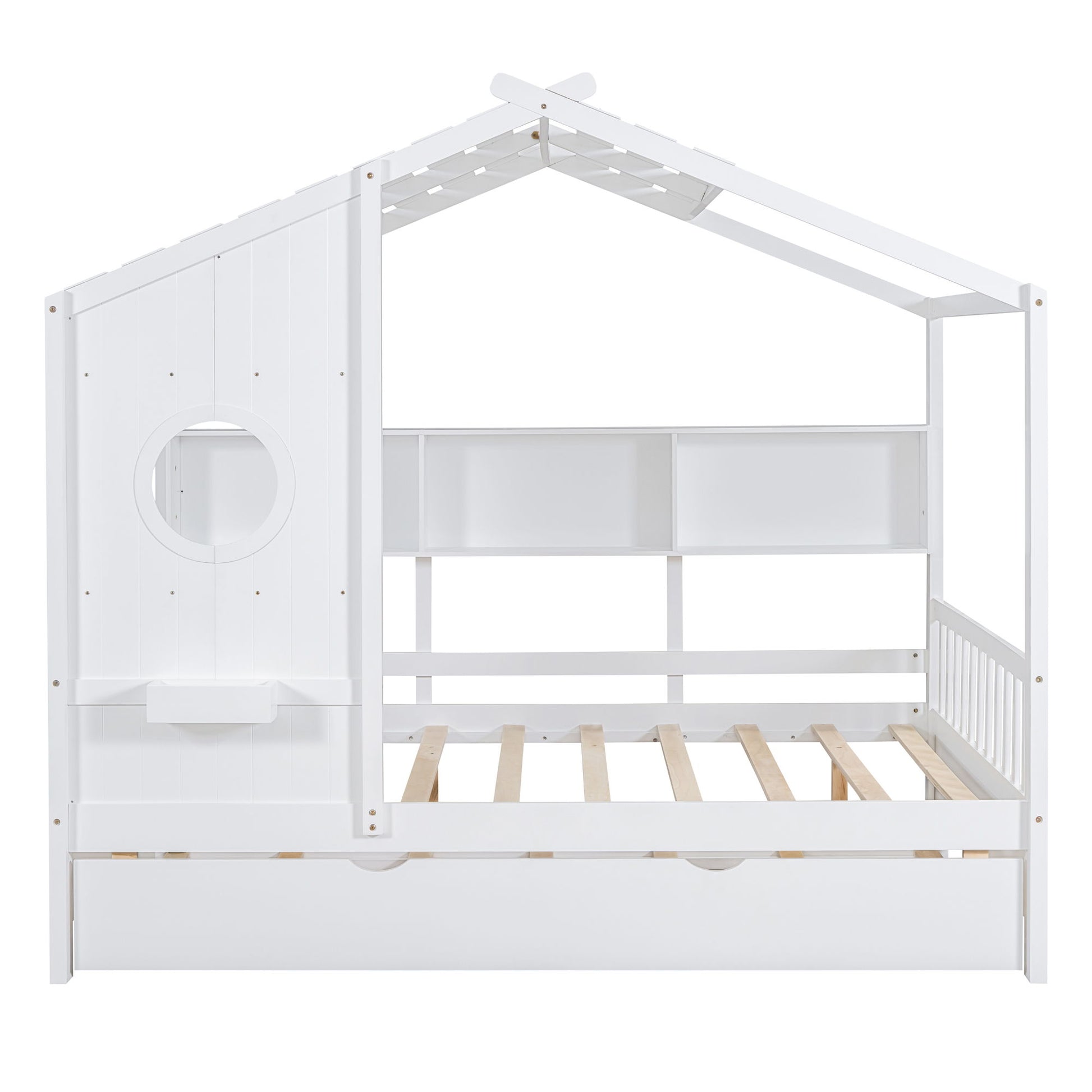 Full Size House Bed With Trundle, Modern Design For Kids With Storage Shlef - White