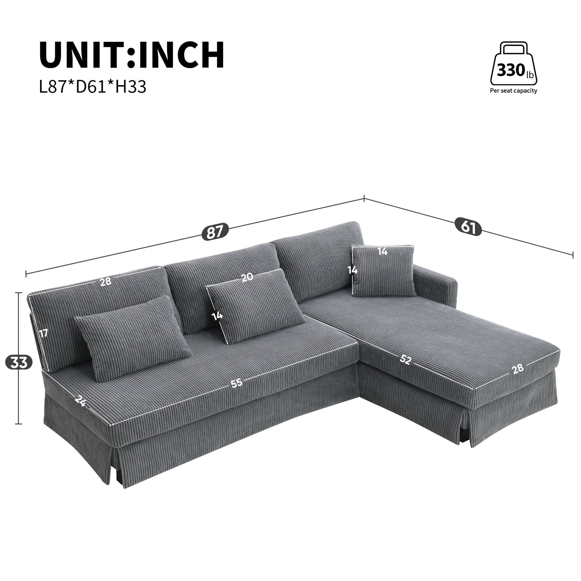 Modern L-Shaped Corduroy Sofa With Reversible Chaise, 4 Seat Upholstered Sectional Indoor Furniture, Convertible Sleeper Couch With Pillows - Gray