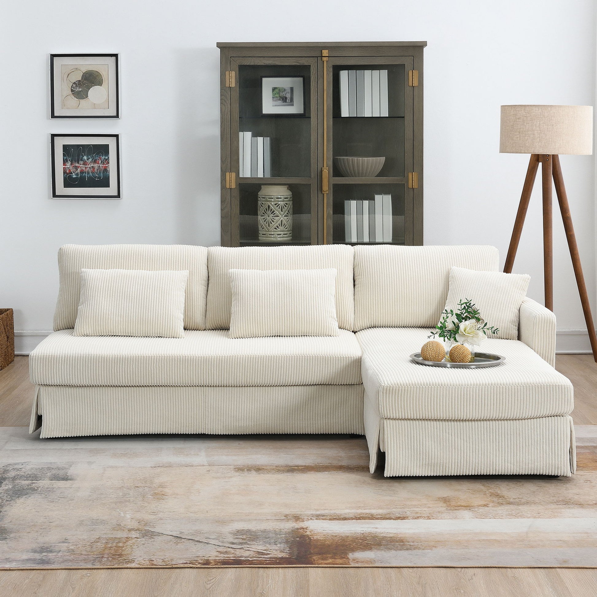 Modern L-Shaped Corduroy Sofa With Reversible Chaise, 4 Seat Upholstered Sectional Indoor Furniture, Convertible Sleeper Couch With Pillows - Beige