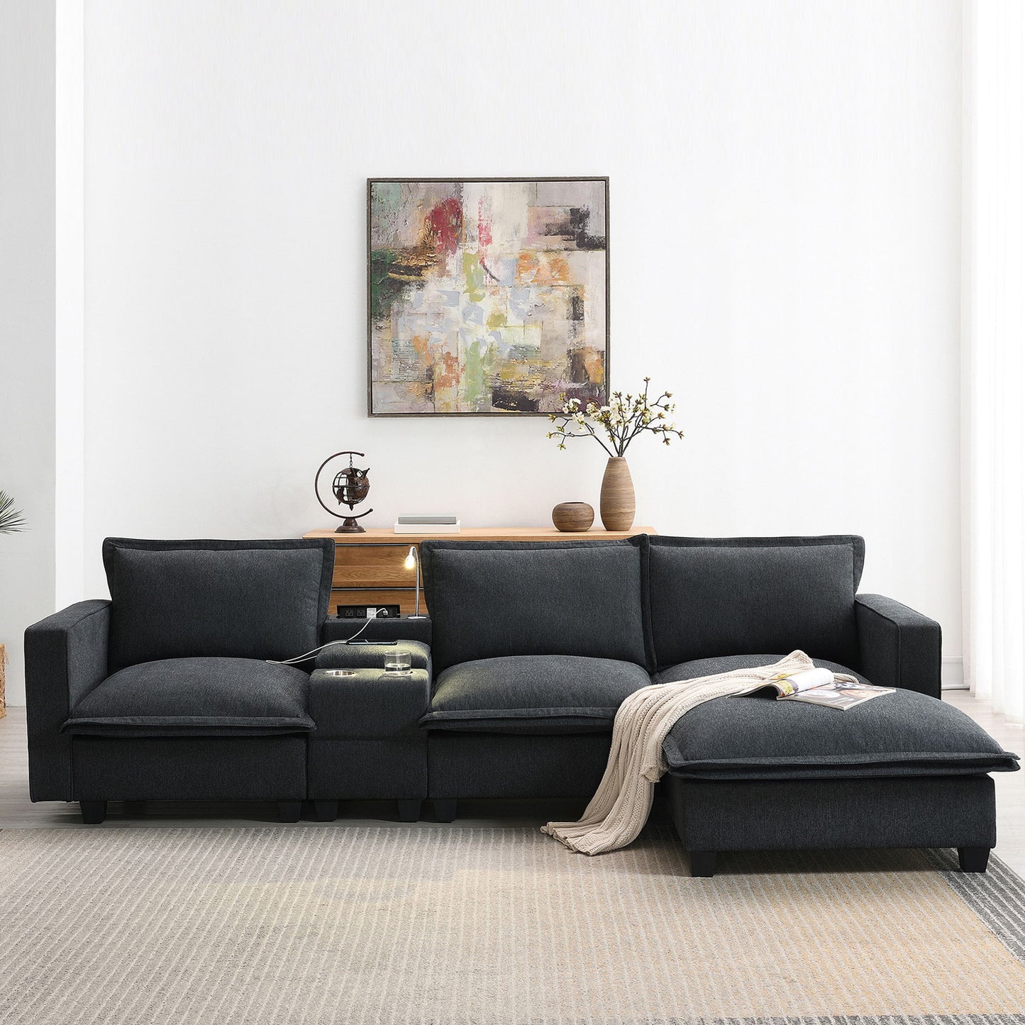 Modern Sectional Cloud Sofa With Console USB Charger Reading Light Cup Holder, Wide Seat 4 Seat Modular Couch Storable Indoor Funiture - Dark Gray