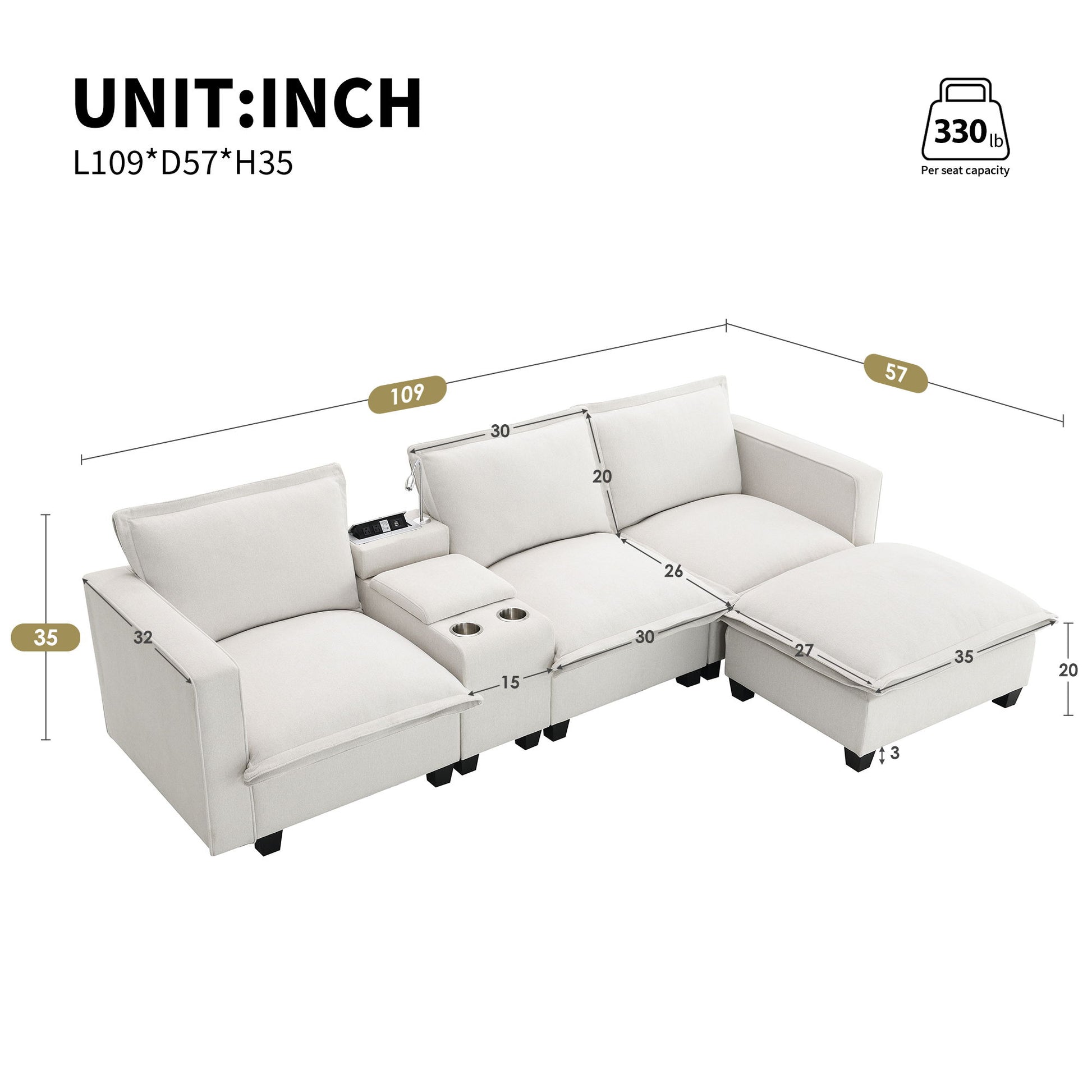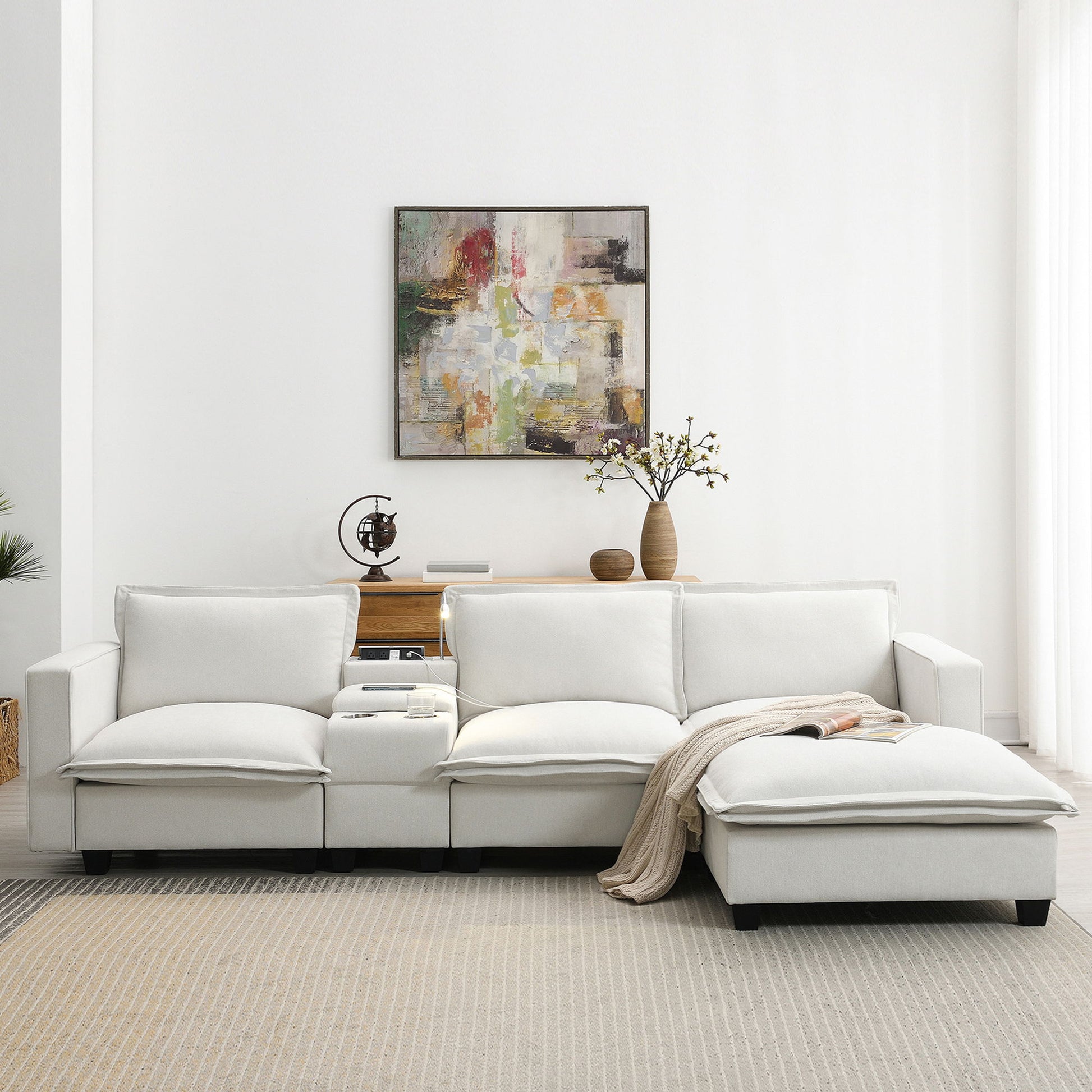 Modern Sectional Cloud Sofa With Console USB Charger Reading Light Cup Holder, Wide Seat 4 Seat Modular Couch Storable Indoor Funiture - Beige
