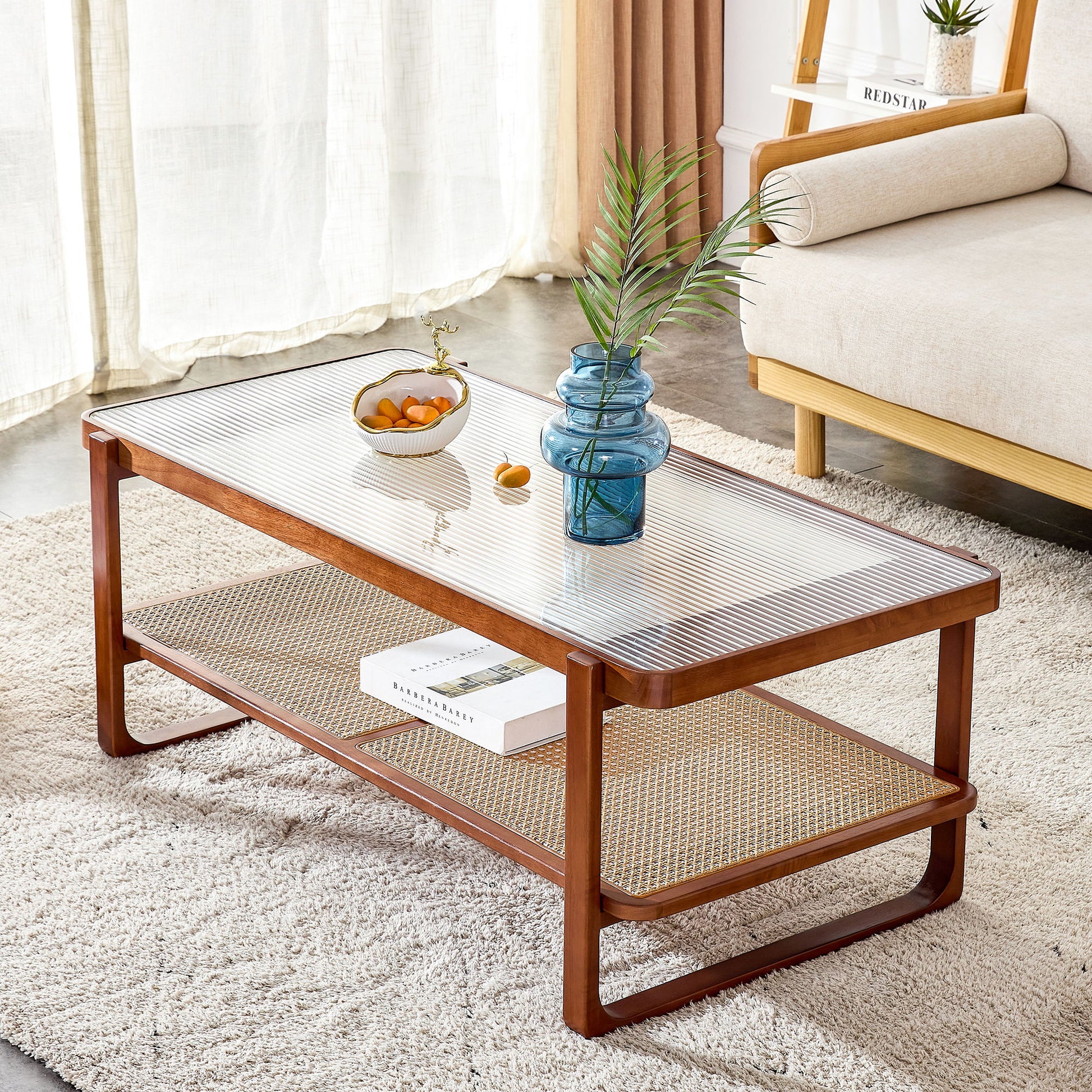 Modern Simple Rectangle Double Layer Solid Wood Glass Desktop Tea Table Rattan Woven Chinese Side Table Small Rectangle Table - Natural Wood