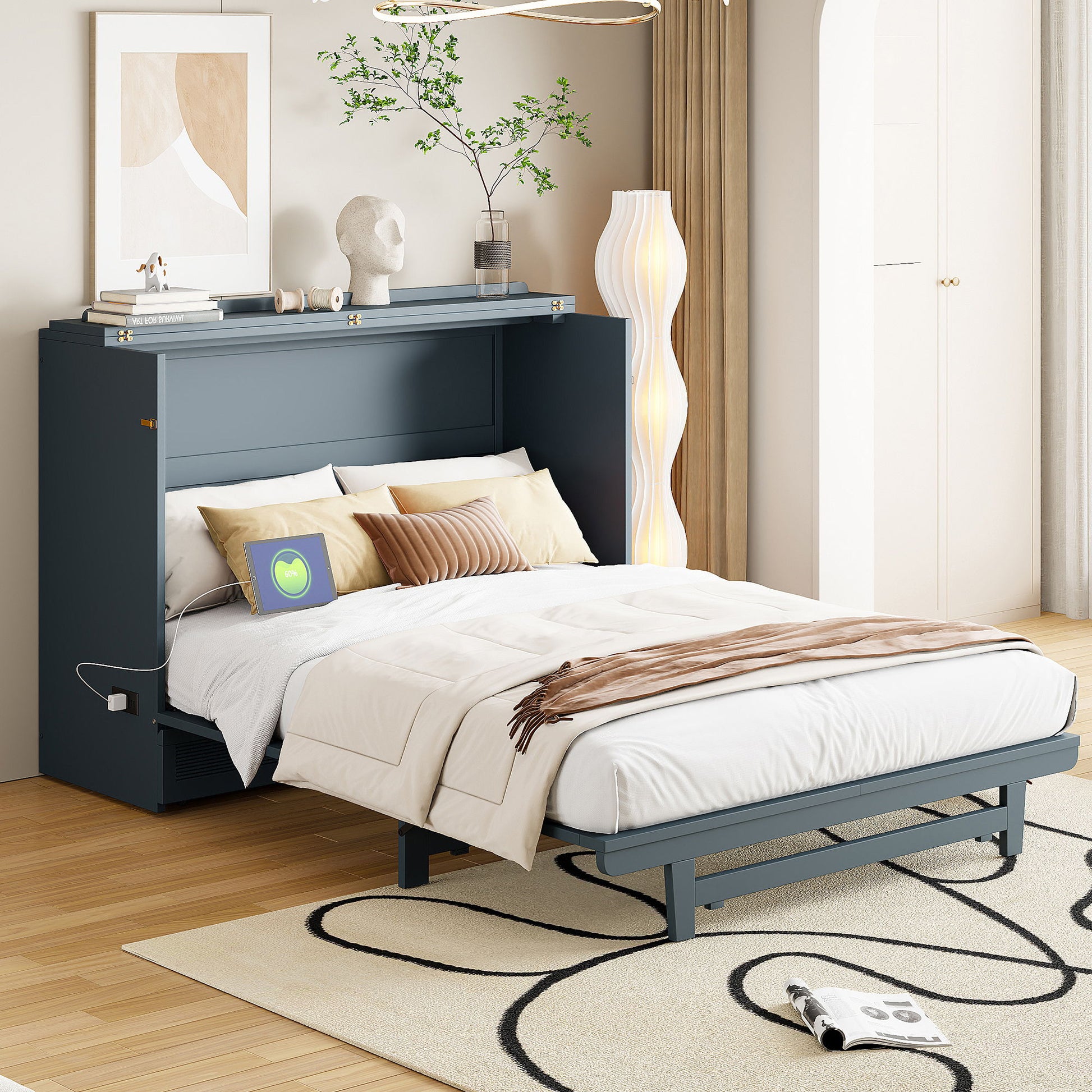 Queen Size Murphy Bed With Large Drawer, USB Ports And Outlets - Gray