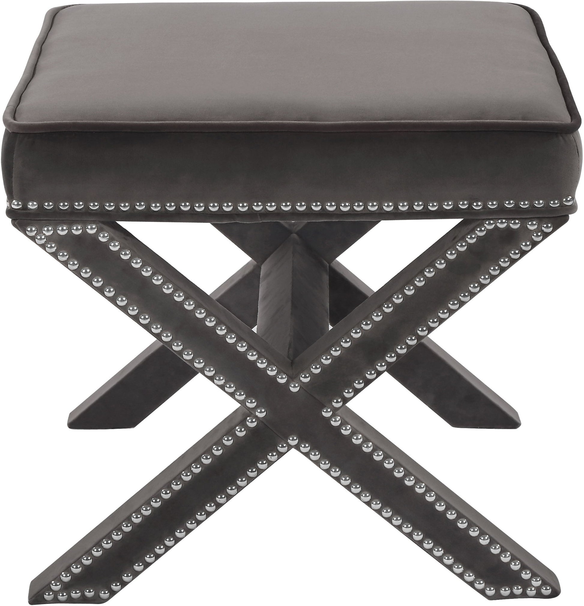 You'll be sitting pretty on this Nixon velvet ottoman/bench. This beautiful piece has a stunning look with its velvet upholstery and nail head trim that gives your room a decidedly contemporary vibe. The X-shaped legs are sturdy and stout, making it a beautifully durable addition to your space. The ottoman's large top accommodates your feet while you relax and unwind with a good book, or pull it out on game night for an extra seat.