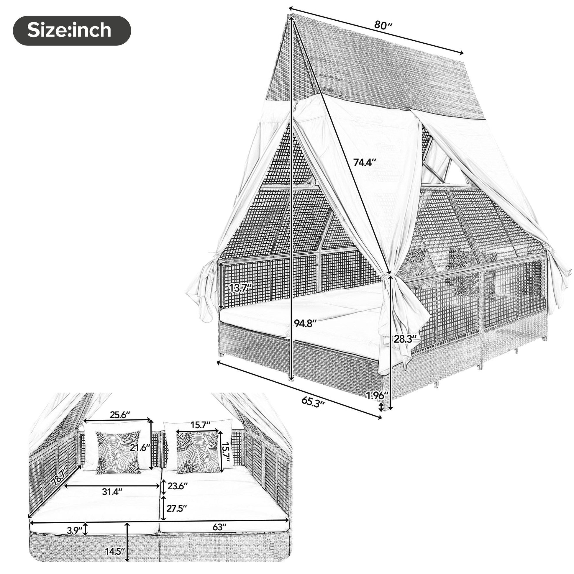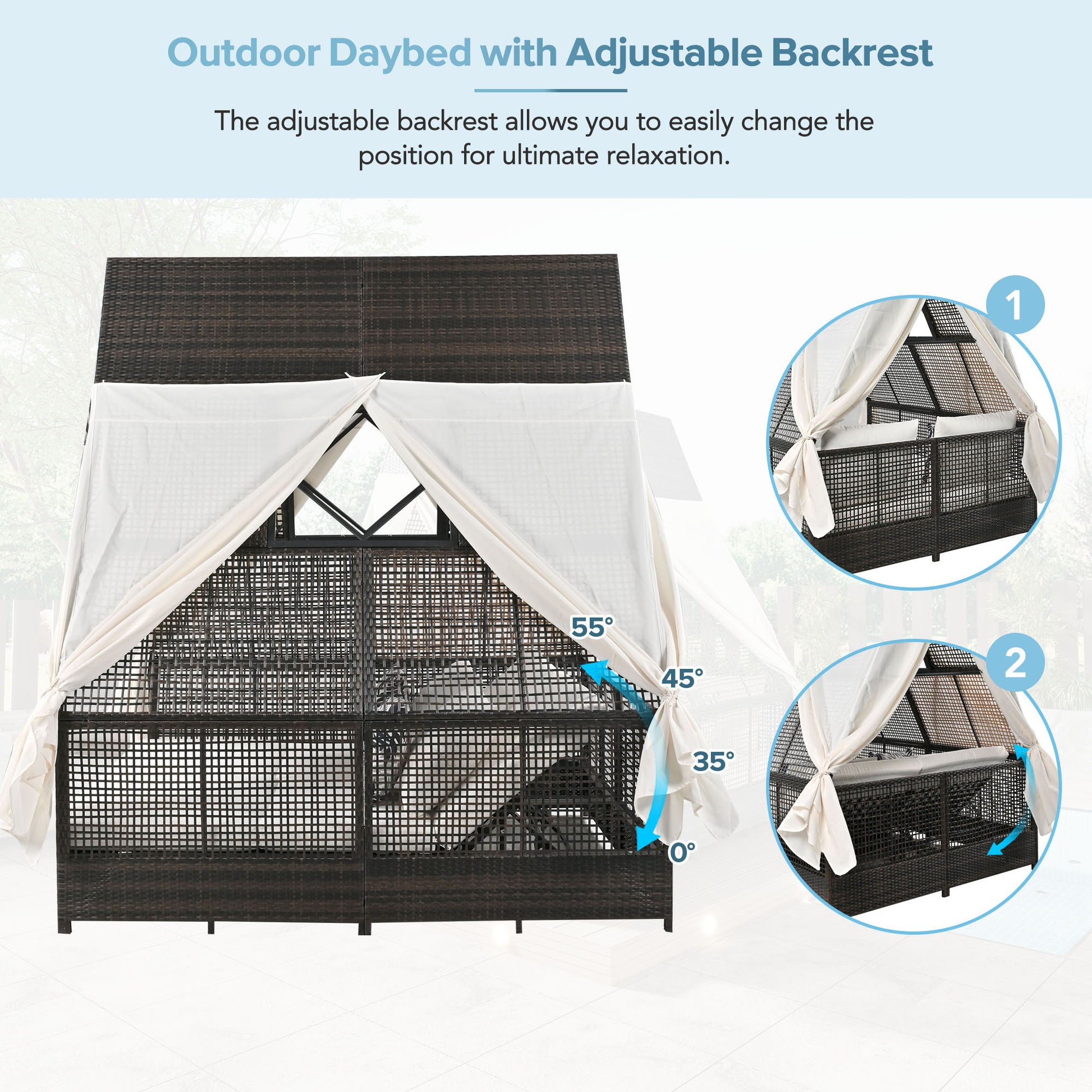 Outdoor Daybed Patio Lounge Bed With Adjustable Backrest Double Sun Lounger With Curtains, 4 Pillows For Garden Patio Poolside Balcony Beach