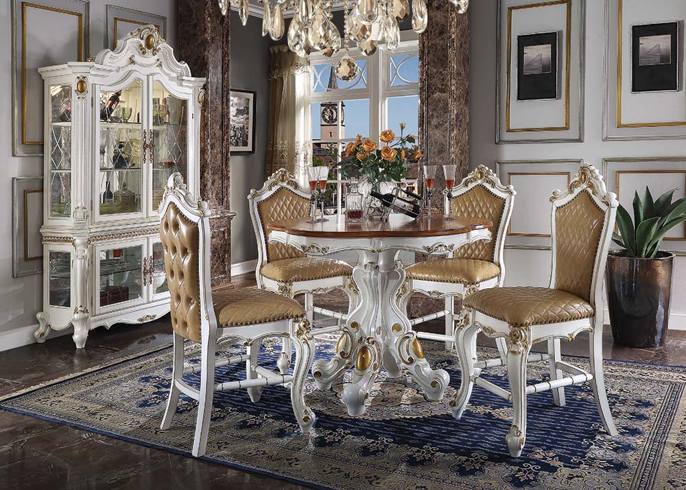Part of Acme’s exclusive Picardy collection, this impressive counter height dining set features a round pedestal table with spectacular antique hand-brushed accents over an elegant antique finish.