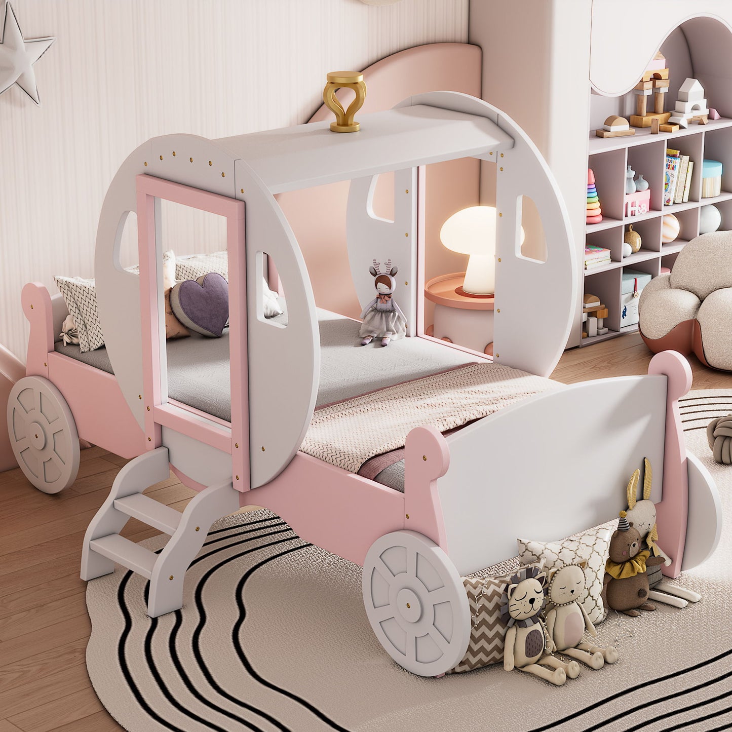 Twin Size Princess Carriage Bed With Crown, Platform Car Bed With Stair - White / Pink