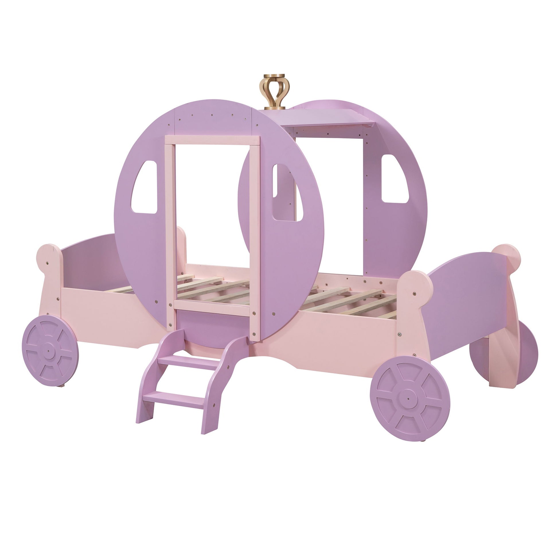 Twin Size Princess Carriage Bed With Crown, Platform Car Bed With Stair - Purple / Pink