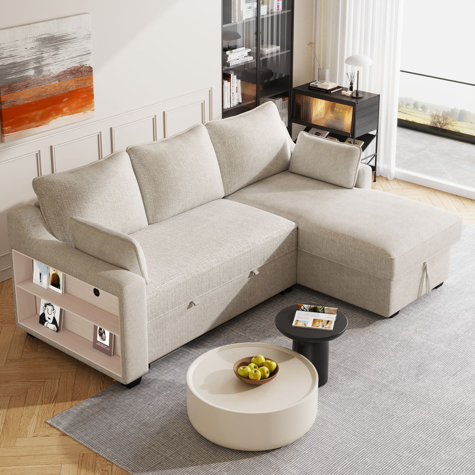 Pull Out Sleeper Sofa L-Shaped Couch Convertible Sofa Bed With Storage Chaise, Storage Racks And USB Ports - Beige