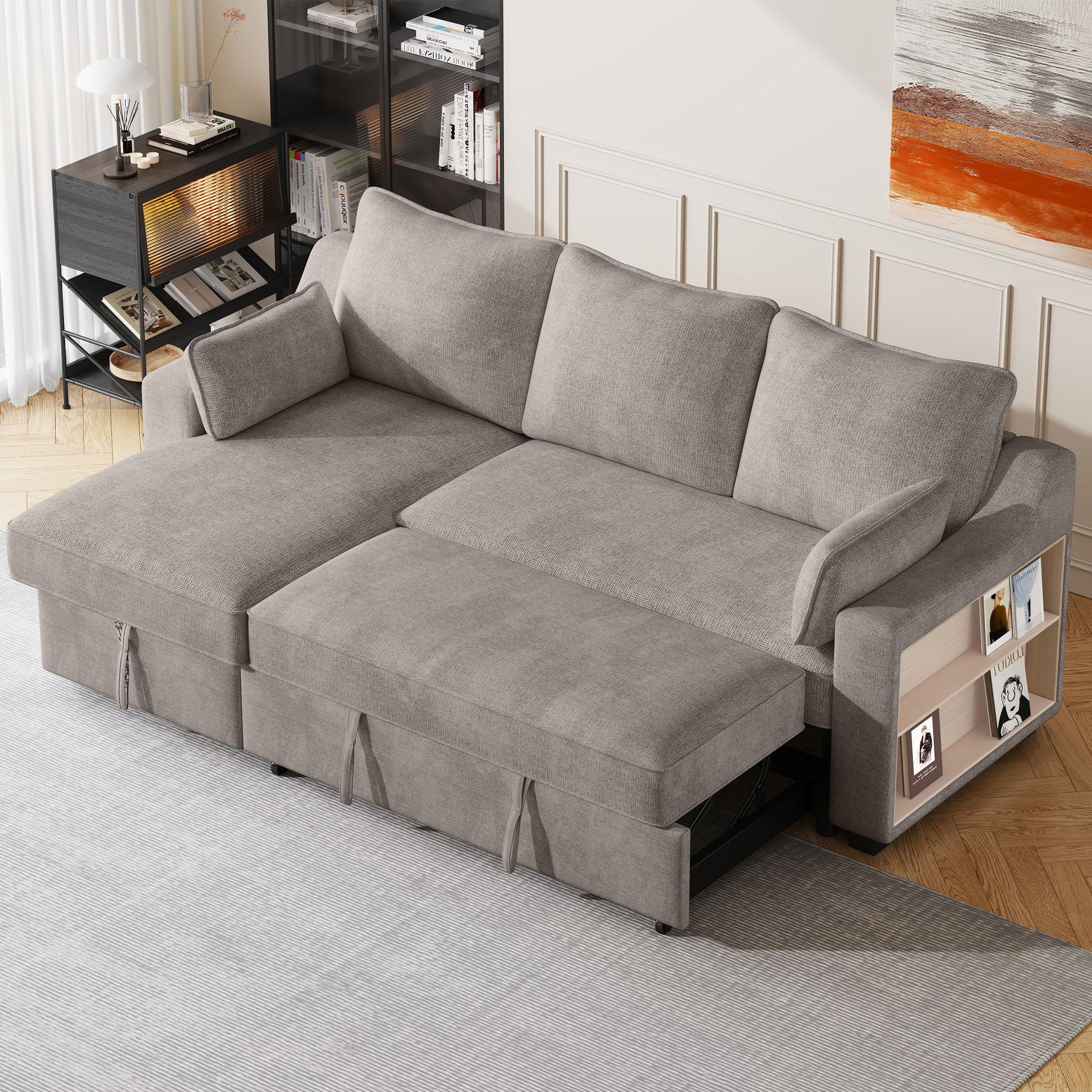 Pull Out Sleeper Sofa L-Shaped Couch Convertible Sofa Bed With Storage Chaise, Storage Racks And USB Ports