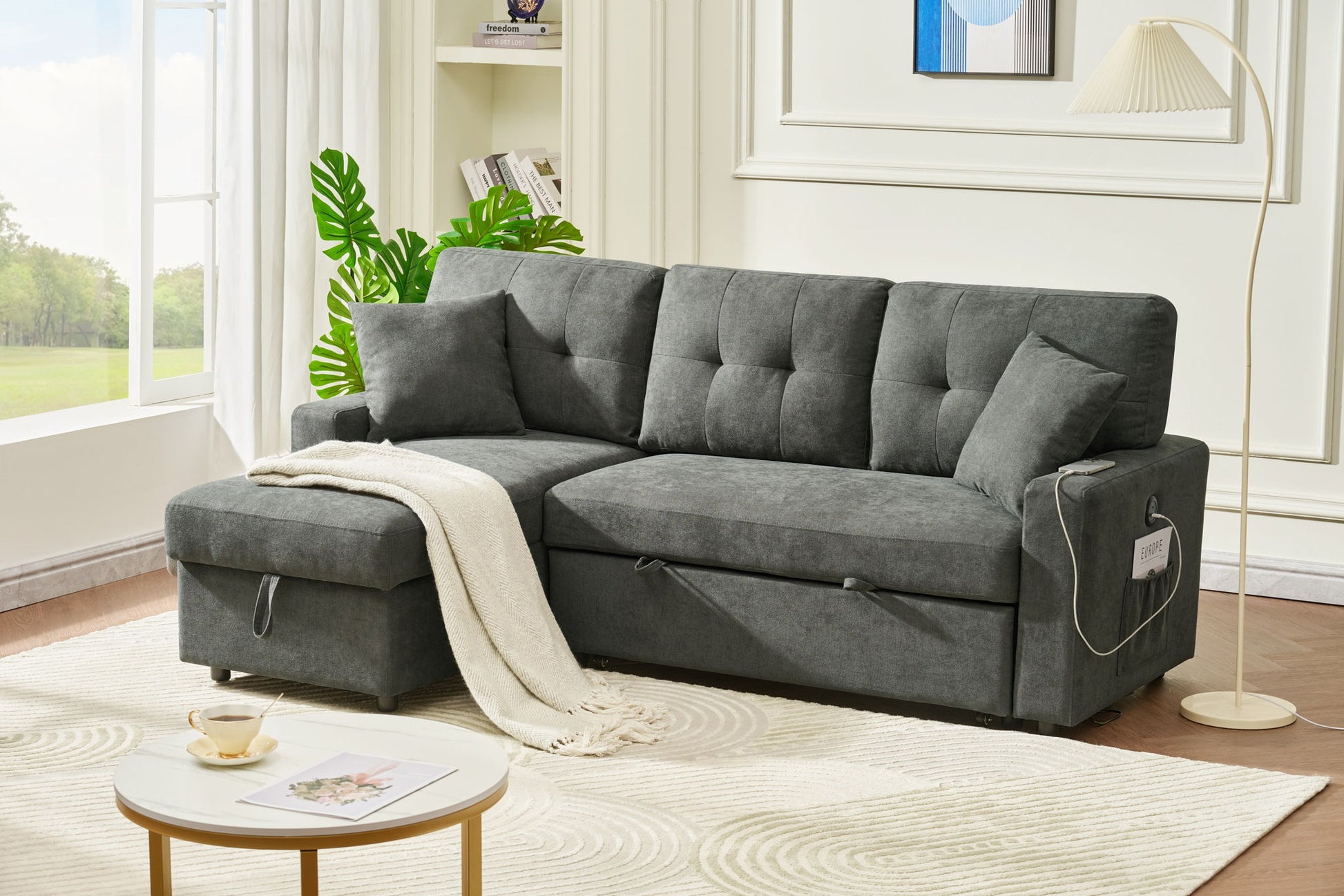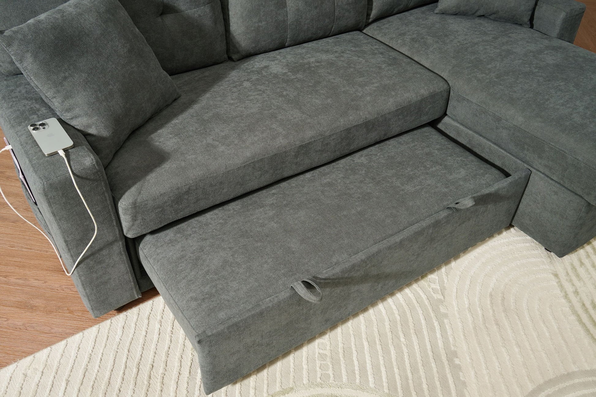 Sectional Sofa Bed L Shaped Sofa Couch Bed With USB Port, Reversible Sofa Couch Sleeper With Pull Out Bed, Chaise With Storage, Pull Out For Living Room - Dark Gray