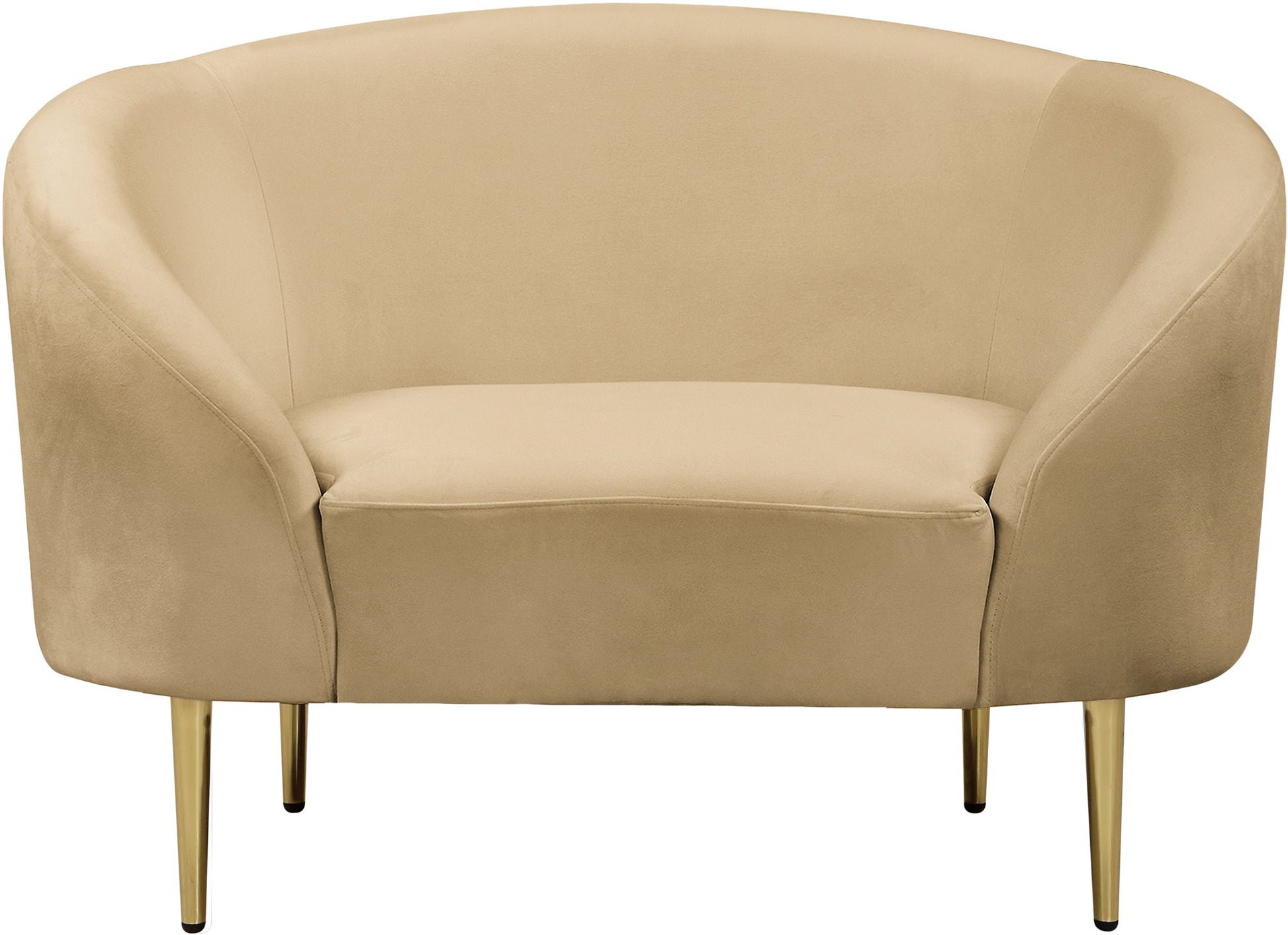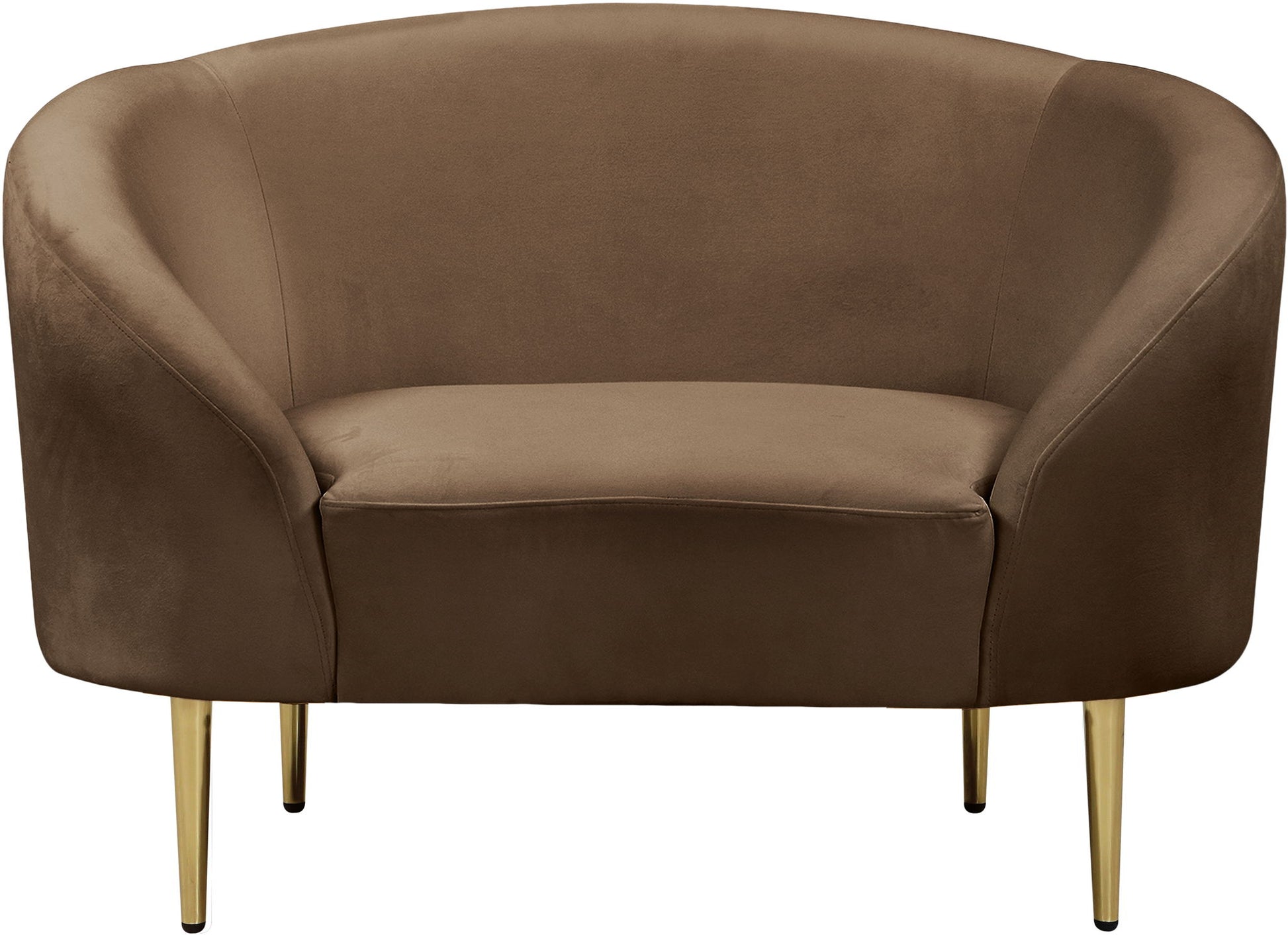 Get comfy while remaining chic in this elegant Ritz velvet chair. Plush-colored upholstery provides a soft texture that is pleasing to the senses, while its curved design offers a contemporary touch to your home furnishing. metal legs complement the chair's sophisticated color, creating a gallant piece anyone would be proud to display in their home.