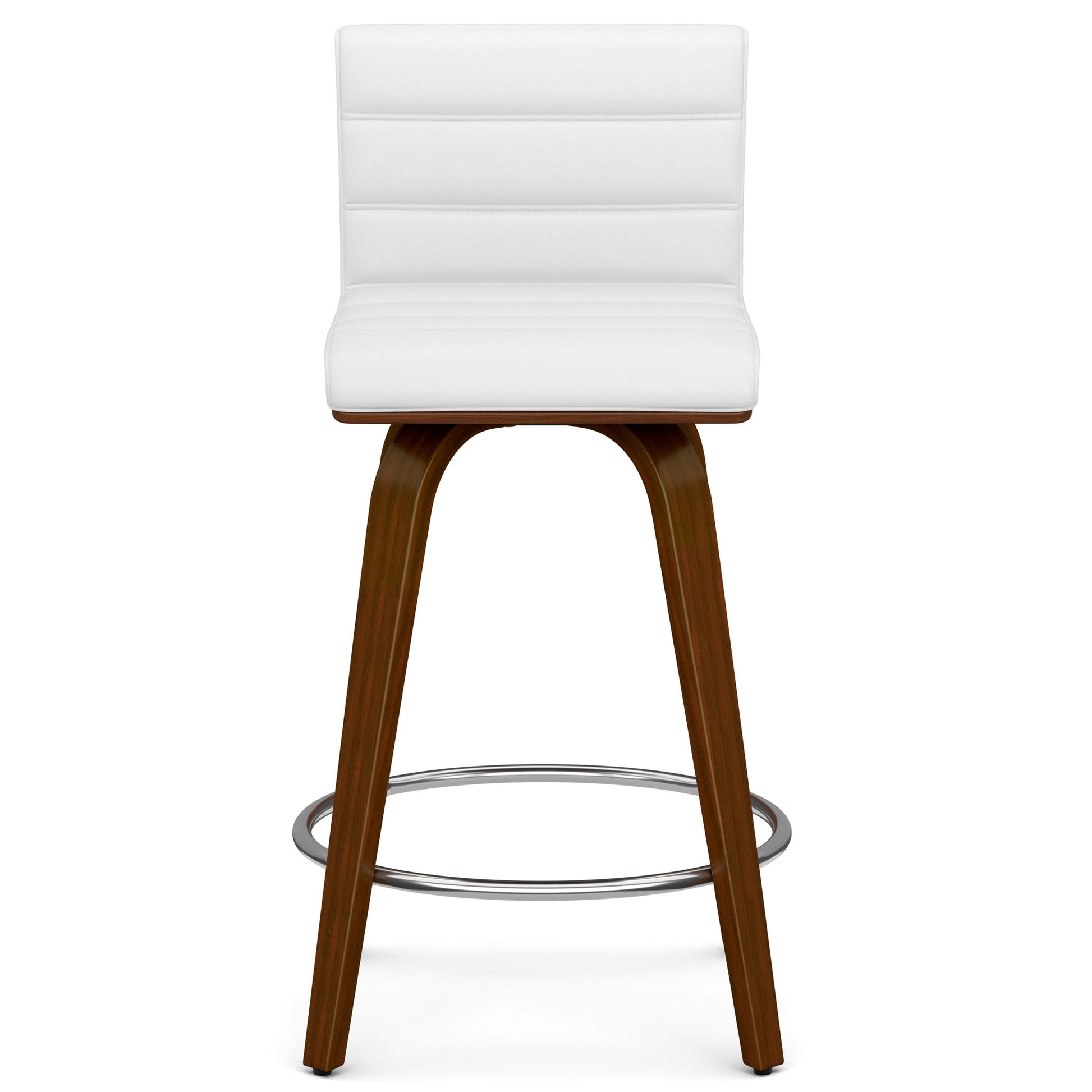- Features 360-degree swivel seat and curved wooded legs with metal foot rest