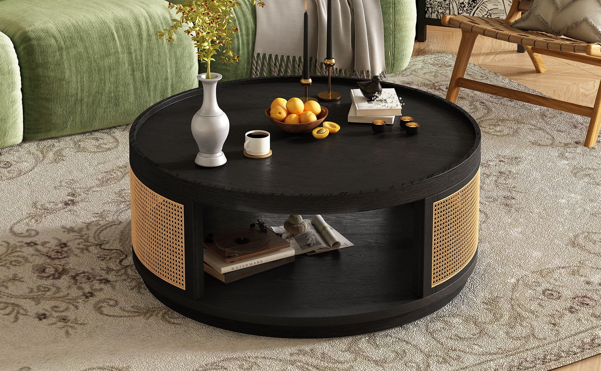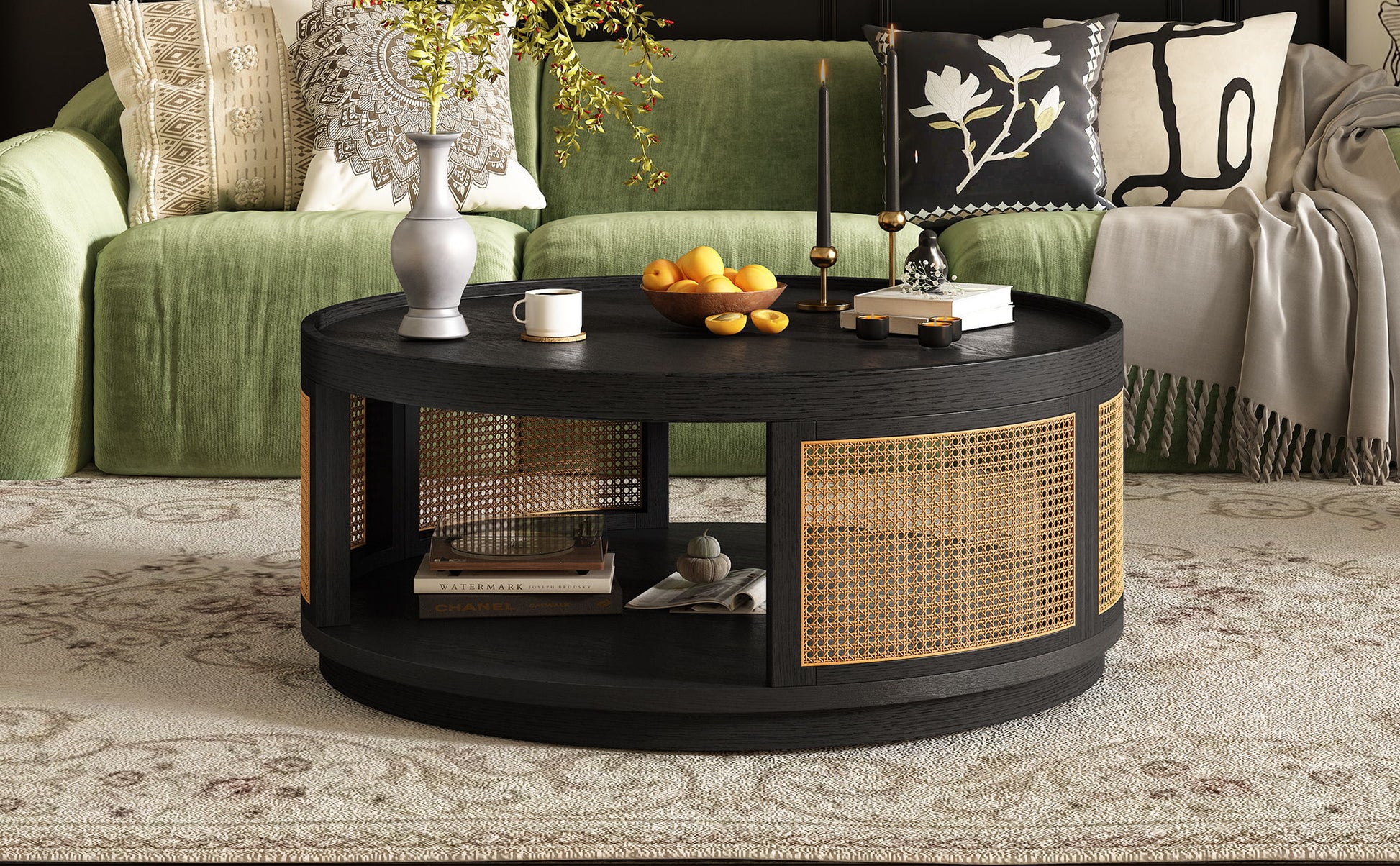 Wooden Mid-Century Modern Coffee Table, Round Cane Coffee Table With Side For Living Room - Dark Brown