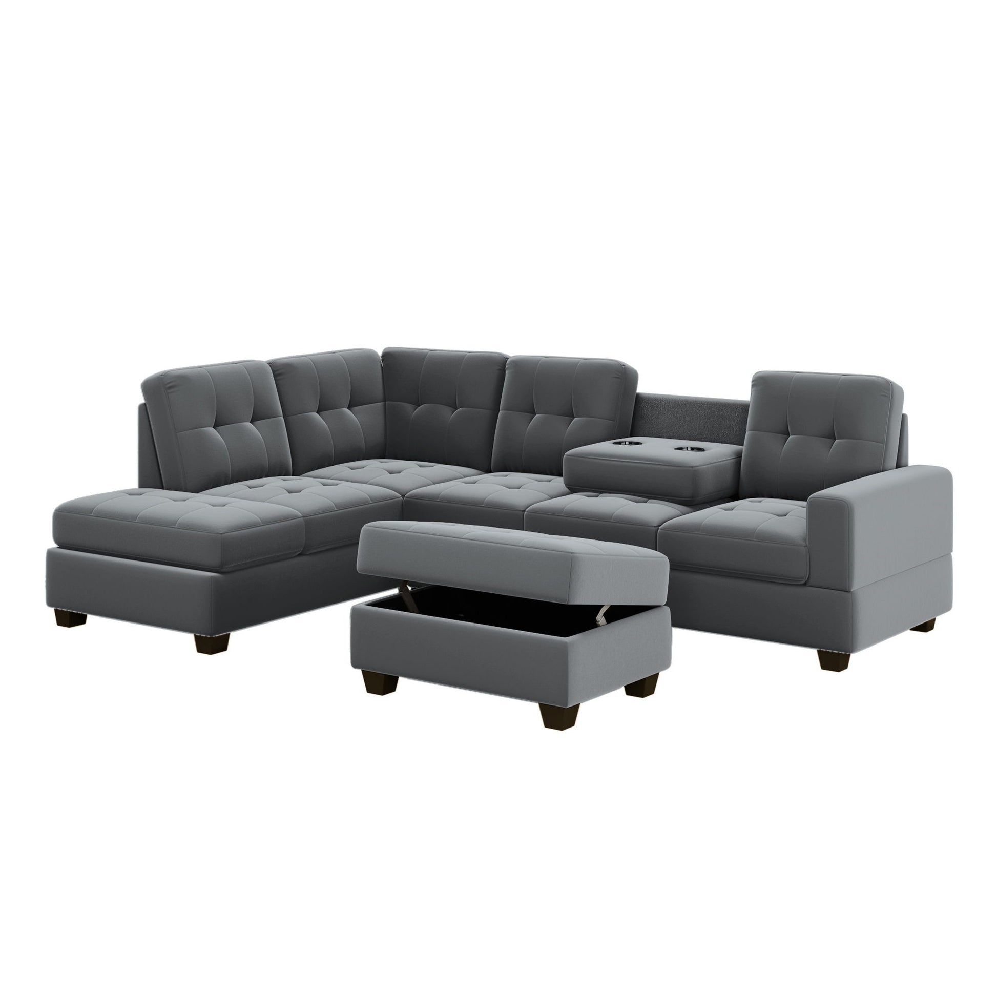 Sectional Sofa With Reversible Chaise Lounge, L-Shaped Couch With Storage Ottoman And Cup Holders - Gray