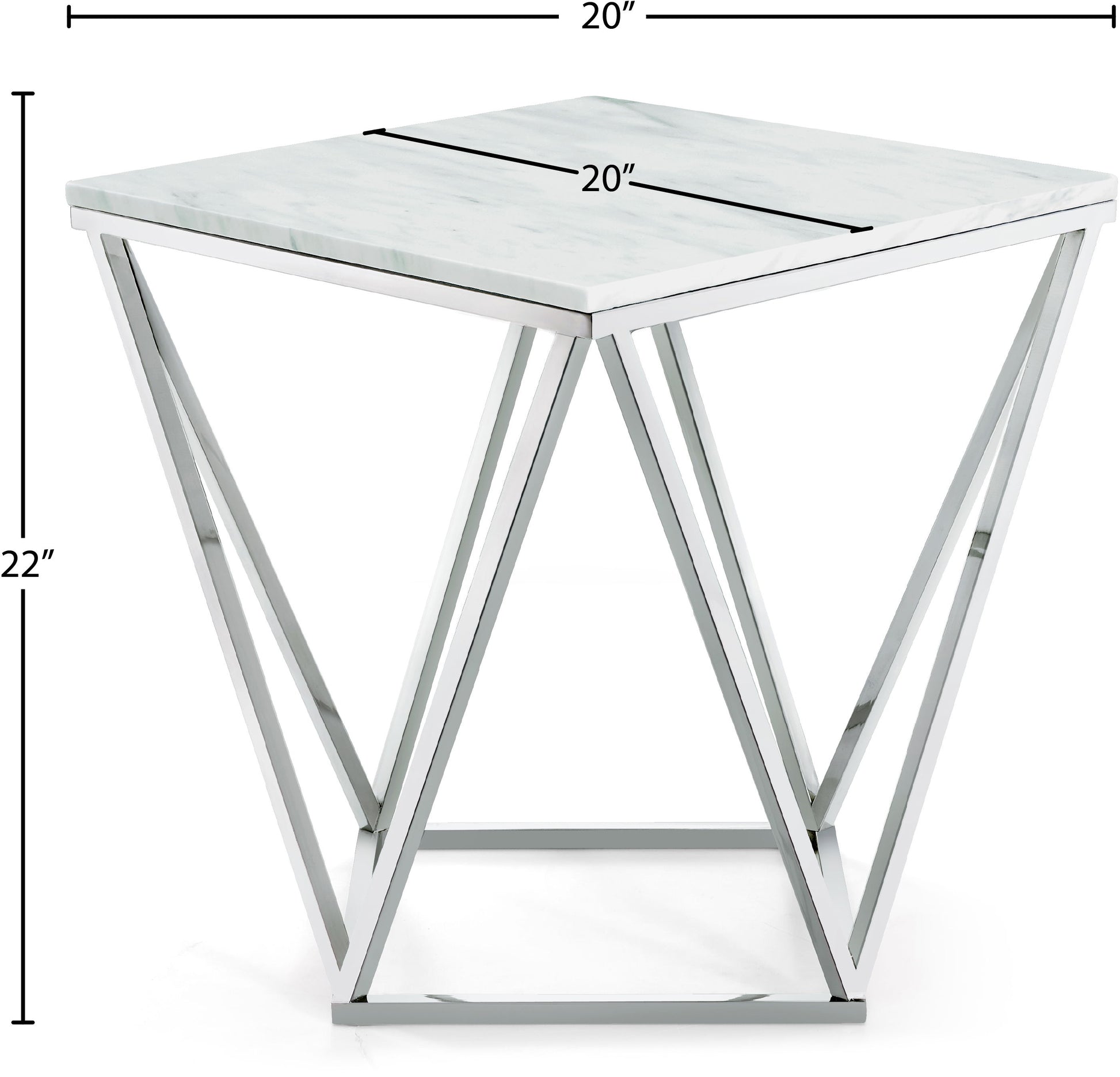 Keep the modern vibe going with this Skyler stainless steel end table from Meridian Furniture. This end table features architectural bases with a sculptural design that's chic and contemporary. The top of the table features Genuine Marble Top for durability and remarkable style.