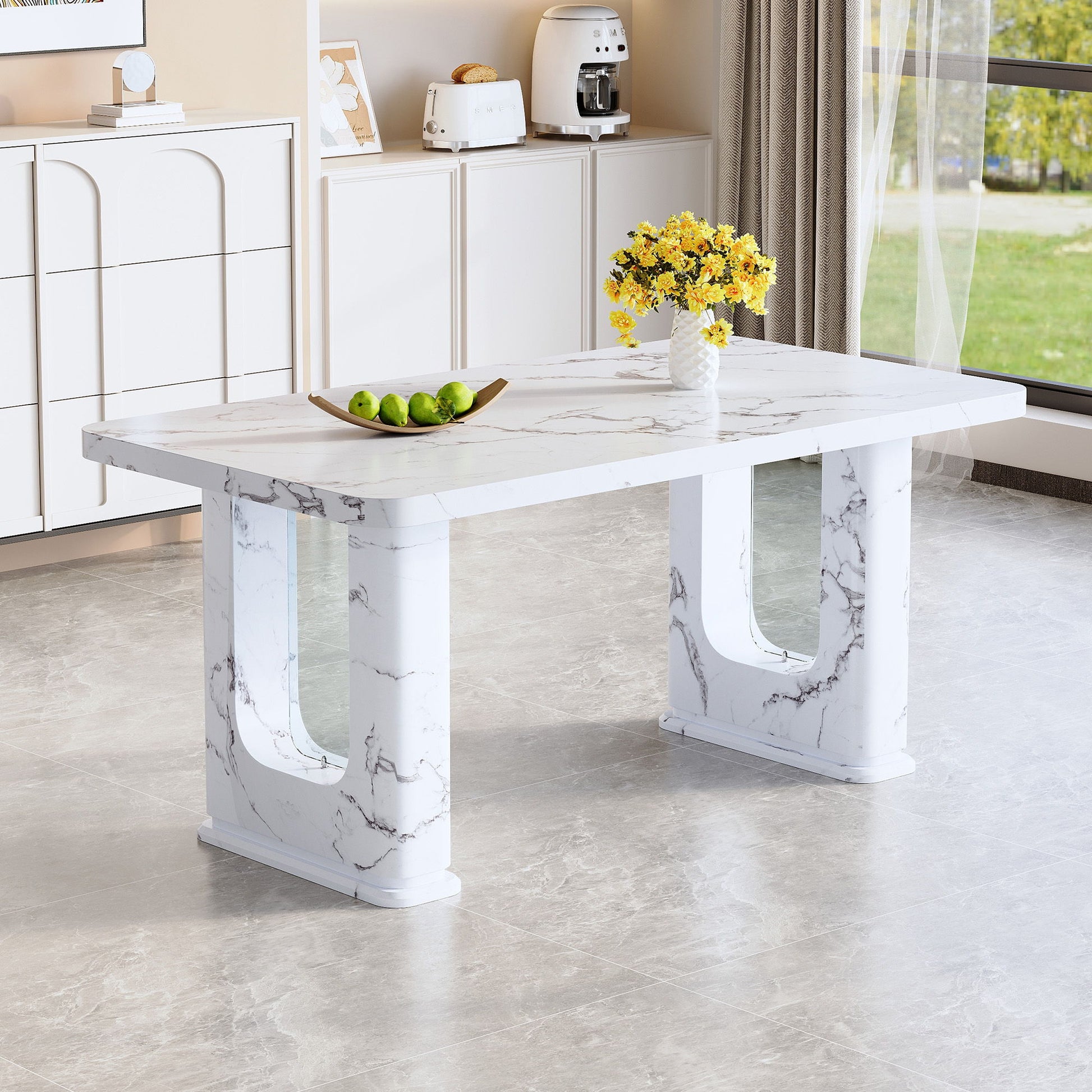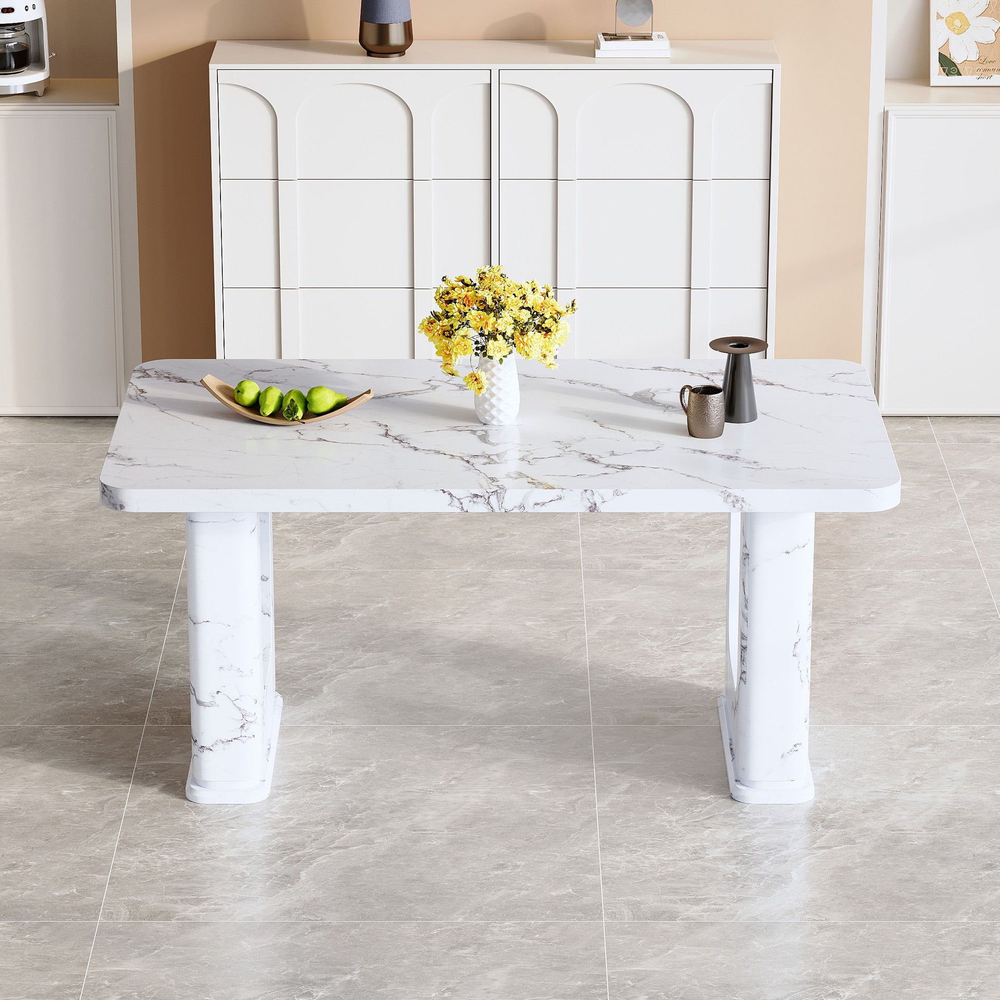 Stylish Marble Textured Dining Table With Glass Elements - Transparent / White