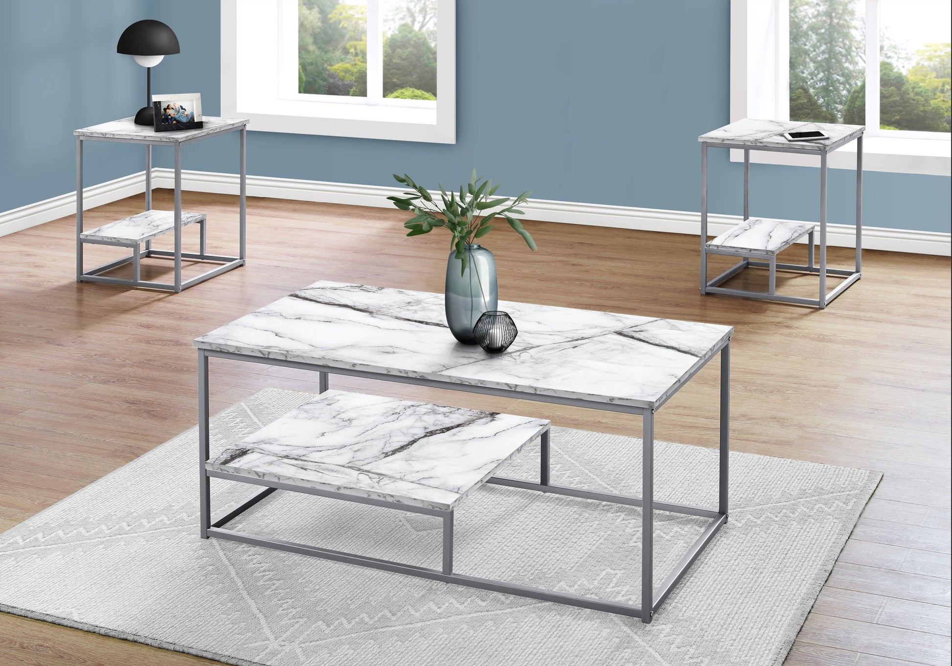 Table Set, Coffee, End, Side, Accent, Living Room, Marble Look Laminate, Contemporary, Modern (Set of 3) - White