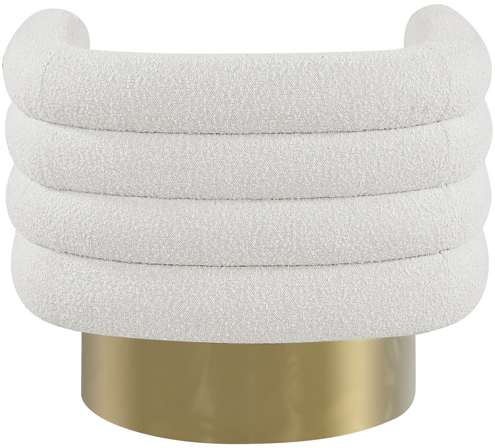 This Tessa boucle fabric accent chair is destined to become a conversation piece wherever you choose to use it. This eye-grabbing chair features a brushed base that supports the body of the chair. Rich boucle fabric upholstery covers every inch of the chair's body, giving it a welcoming feel that's soft and inviting to the touch. Deep channel tufting adds to the contemporary flair of this swiveling accent chair.