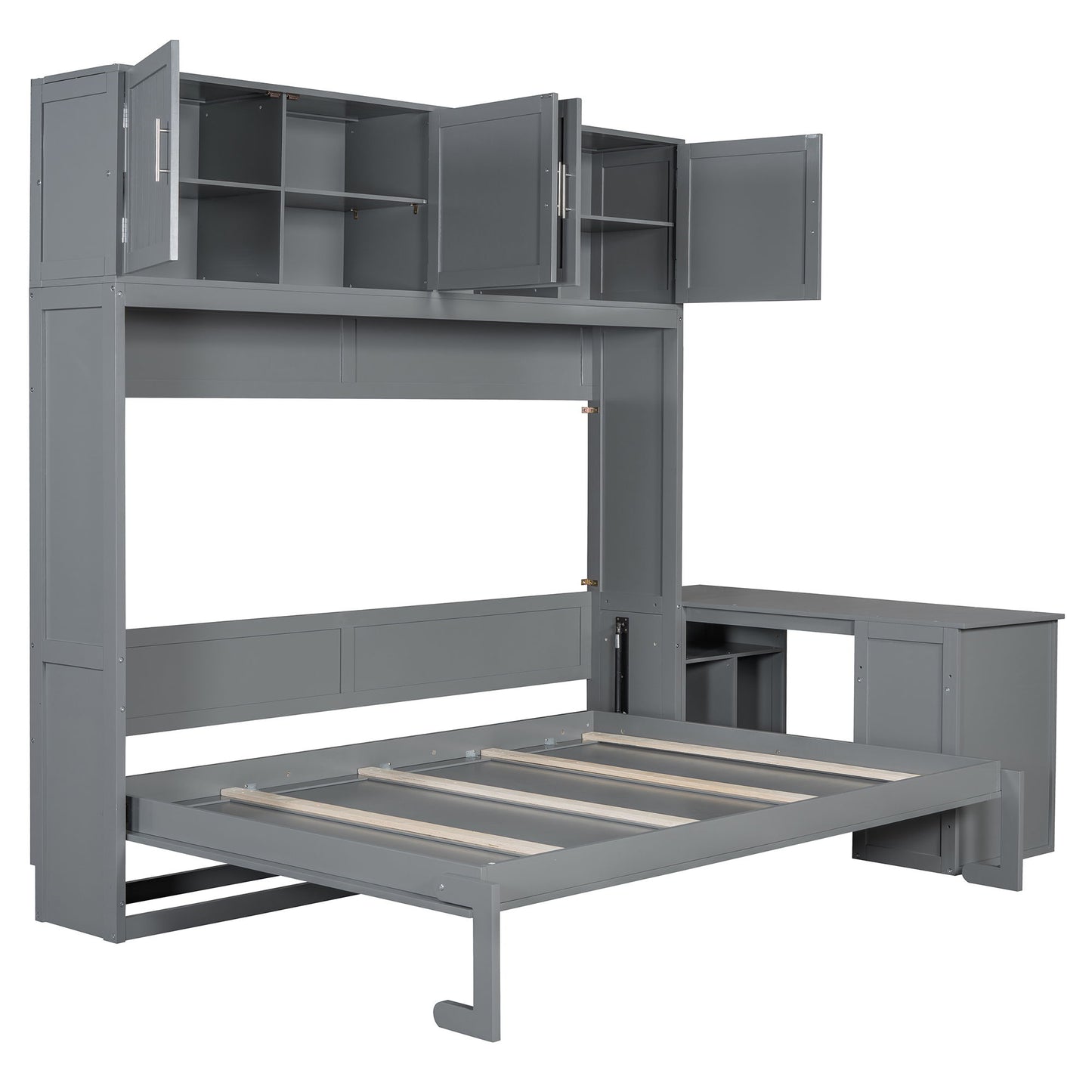 Queen Size Wall Murphy Bed With Desk And Storage Shelves And Big Cabinets - Gray