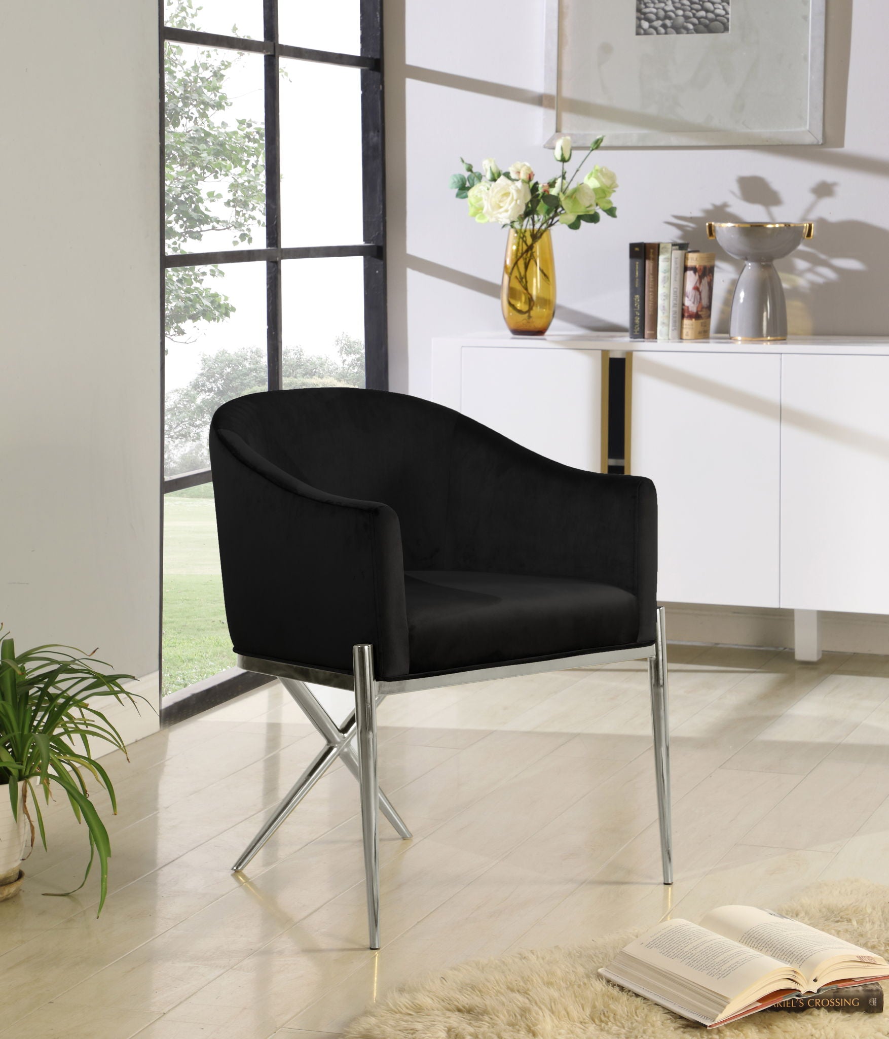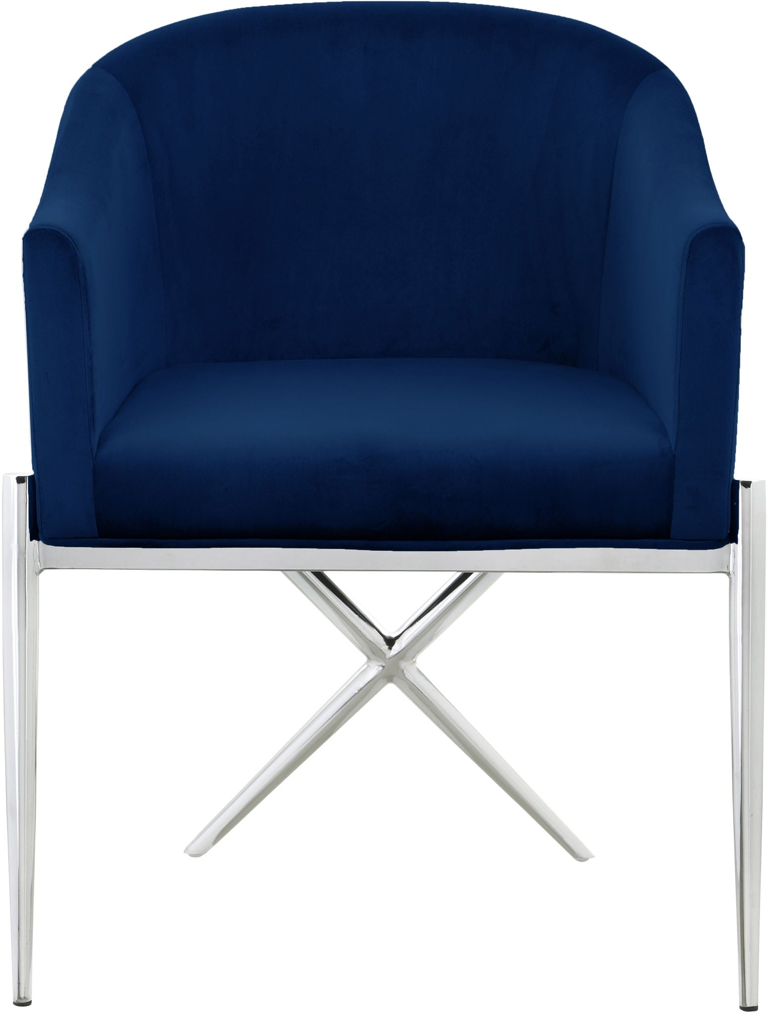 Spread elegance and modernity to your dining room with this Xavier velvet dining chair from Meridian Furniture. This beautiful chair features a simple barrel seat with a plush cushion and back, ensuring that every meal is a comfortable one. The steel legs provide durable support while you sit, and an "X" leg in the back lends the chair an uber-modern vibe. finishing on the base is sleek and chic, giving this chair a contemporary edge that's well at home in any modern dining room. Sleek velvet upholstery is durable and tough yet soft against your body, elevating meal times to a luxurious experience.